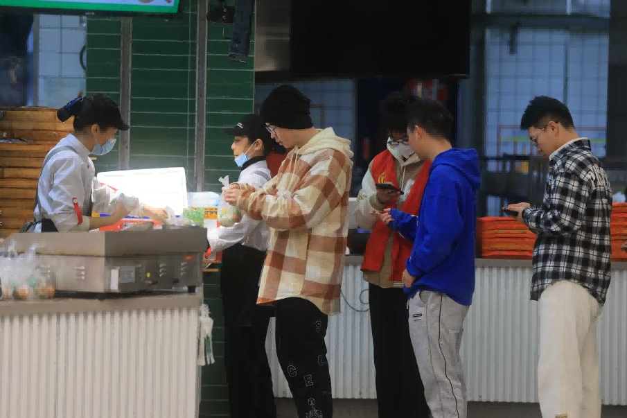 学院党委副书记王小露、艾弗森贝博ballbet官网科技总经理唐佩、辅导员李晨冉、学生志愿者和最后一位领取早餐的同学合影留念